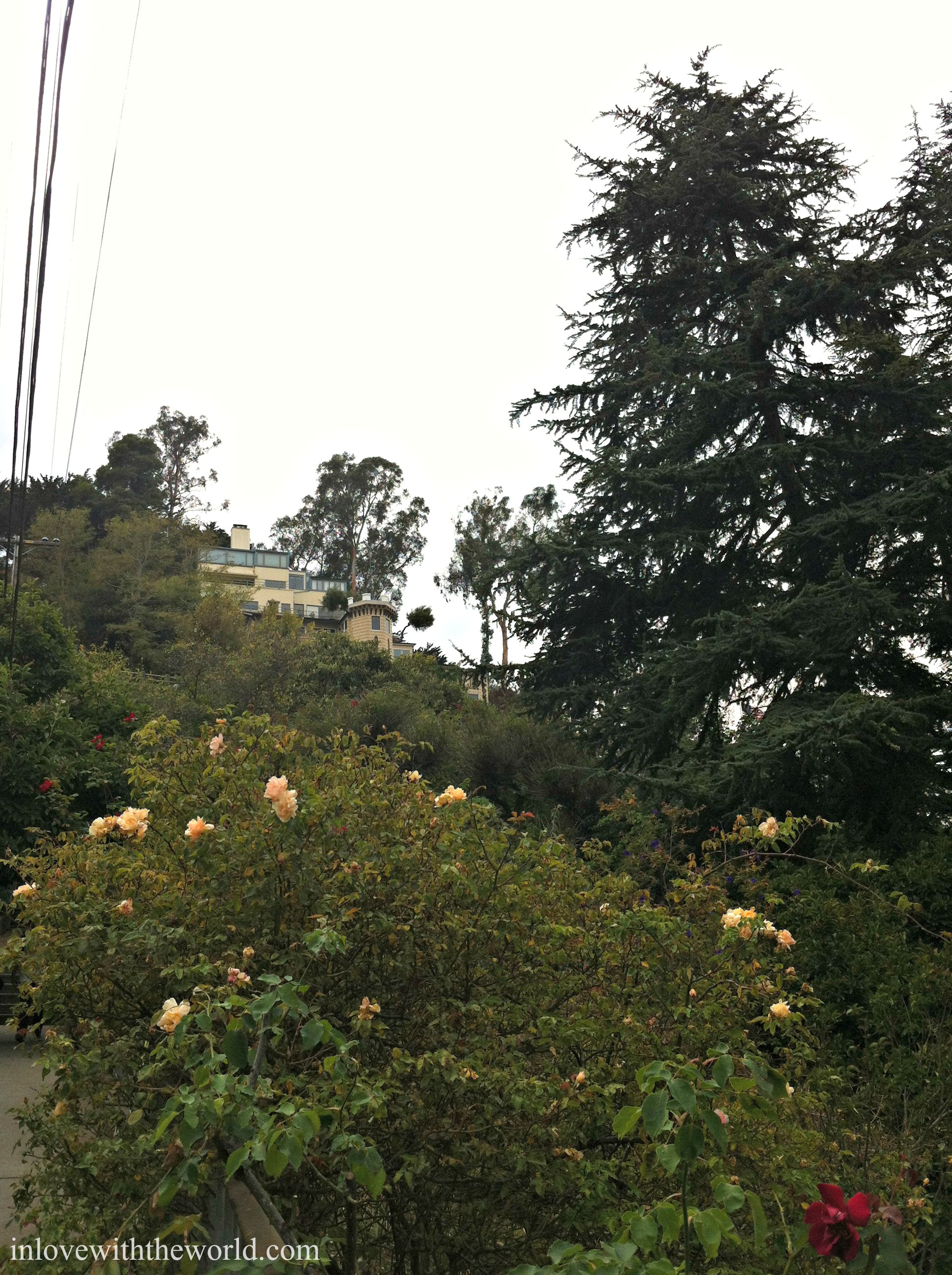 The people that live on this hill keep their gardens impeccable- beautiful flowers and lush green leaves fall over the stair railings.